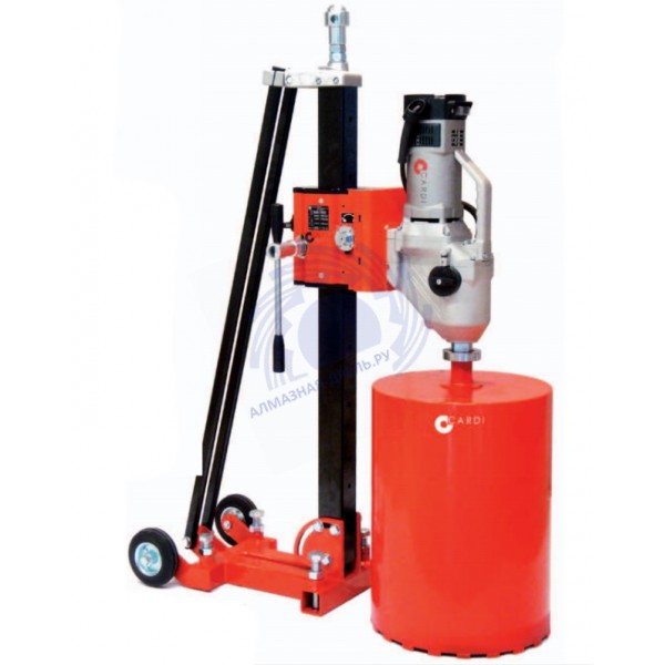 Установка алмазного бурения CARDI 501 состоит из двигателя T9 475-EL и станины Columbus-600. Установка предназначена для сверления отверстий до 500 мм в армированном бетоне, камне, кирпиче и пр. материалах алмазными коронками. В комплект со станиной входит пластина быстросъемного крепления «ласточкин хвост», которая шестью болтами М8 крепится к монтажной площадке на корпусе двигателя. Сверление осуществляется только с водой. Для подачи воды используется коннектор 1/2" с регулировочным краном.